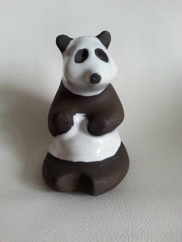 Mid-century beeldje van een panda, in mat zwart en glanzend wit glazuur